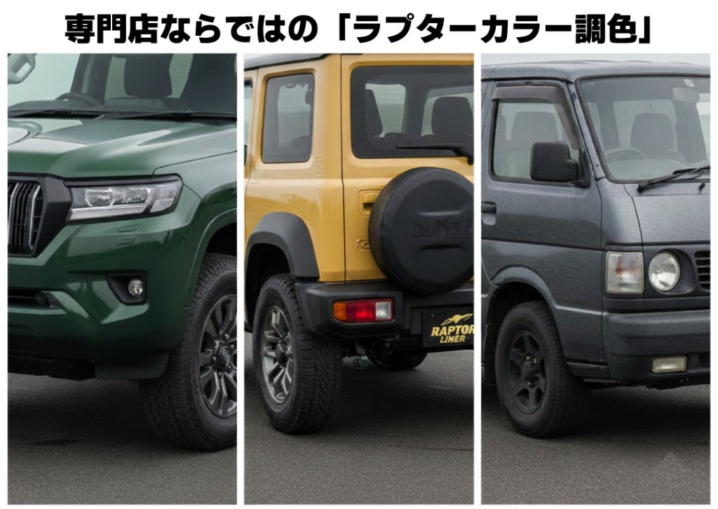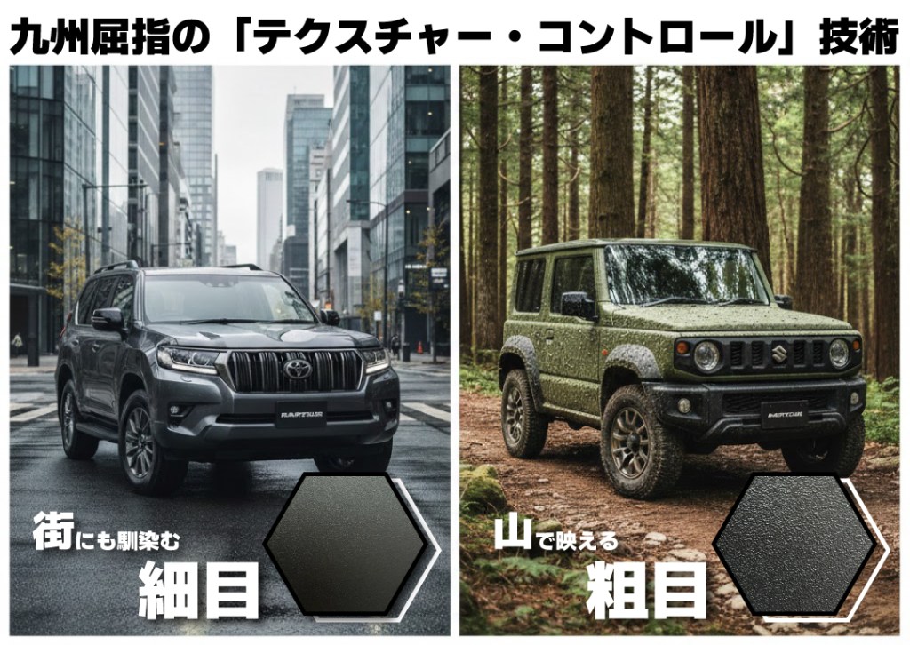 内容: ラプターは吹き方で表情が変わります。「ランクル250には都会に馴染む細目」「ジムニーにはオフロード映えする粗目」など、車種や用途に合わせて肌目を提案・再現できます!