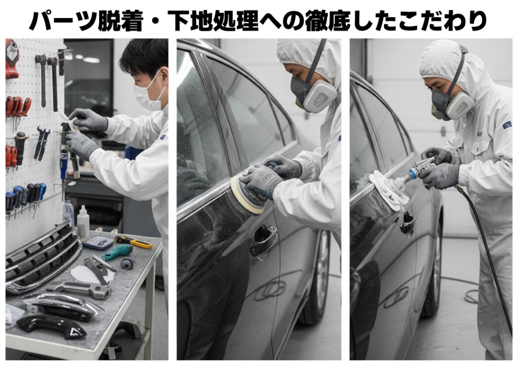 内容: 塗装の寿命は「見えない部分」で決まります。専門店として、パーツをどこまで外して塗るのか、どう脱脂・足付け(傷入れ)をするのかこだわりを持って施工せていただきます。